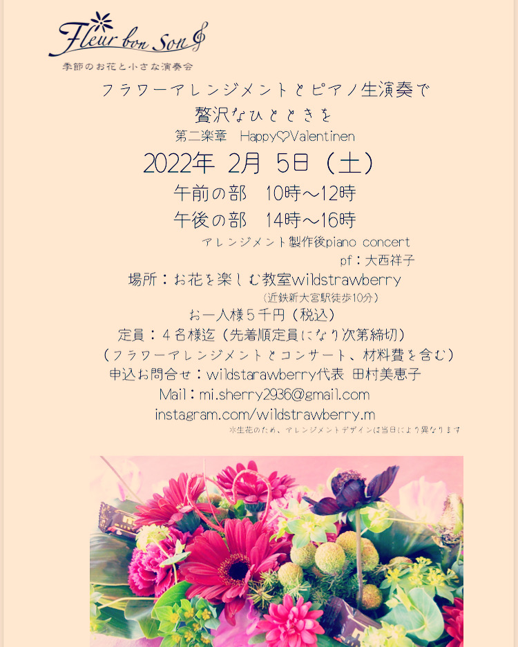 フルール・ボン・サン 季節のお花と小さな演奏会 第二楽章 2023 12/08 トピック フラワーアレンジメントのワークショップ内でピアノ演奏を行いました。その時の様子をお届けします。 フローリスト田村美恵子先生 Instagramはこちら ▶︎ トピック